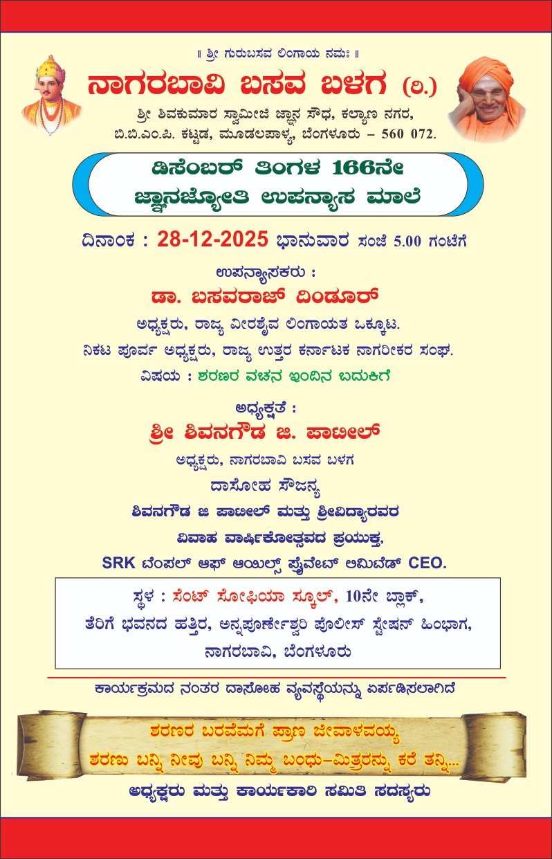 ಬೆಂಗಳೂರು: ನಾಗರಬಾವಿ ಬಸವ ಬಳಗ (ರಿ.) ವತಿಯಿಂದ ಡಿಸೆಂಬರ್ ತಿಂಗಳ 166ನೇ ‘ಜ್ಞಾನಜ್ಯೋತಿ ಉಪನ್ಯಾಸ ಮಾಲೆ’ ಕಾರ್ಯಕ್ರಮವನ್ನು ದಿನಾಂಕ 28-12-2025ರ ಭಾನುವಾರ ಆಯೋಜಿಸಲಾಗಿದೆ.