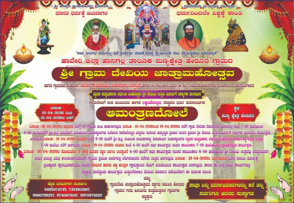 ಹಾನಗಲ್ಲ (ಹಾವೇರಿ ಜಿಲ್ಲೆ): ತಾಲೂಕಿನ ಪುಣ್ಯಕ್ಷೇತ್ರ ಹೇರೂರ ಗ್ರಾಮದಲ್ಲಿ ಇಂದಿನಿಂದ (ಏಪ್ರಿಲ್ 10) ಶ್ರೀ ಗ್ರಾಮ ದೇವಿಯ ಜಾತ್ರಾಮಹೋತ್ಸವ, ಗ್ರಾಮದೇವಿಯ ಪ್ರತಿಷ್ಠಾಪನೆ, ನೂತನ ಮಹಾದ್ವಾರದ ಉದ್ಘಾಟನೆ ಹಾಗೂ ಶ್ರೀ ಗುರು ಸಿದ್ಧಲಿಂಗ ಶಿವಾಚಾರ್ಯ ಮಹಾಸ್ವಾಮಿಗಳವರ ದ್ವಾದಶ ಪಟ್ಟಾಧಿಕಾರದ ವರ್ಧಂತಿ ಮಹೋತ್ಸವದ ಸರಣಿ ಕಾರ್ಯಕ್ರಮಗಳು ಅತ್ಯಂತ ಸಡಗರದಿಂದ ಆರಂಭವಾಗಲಿವೆ.