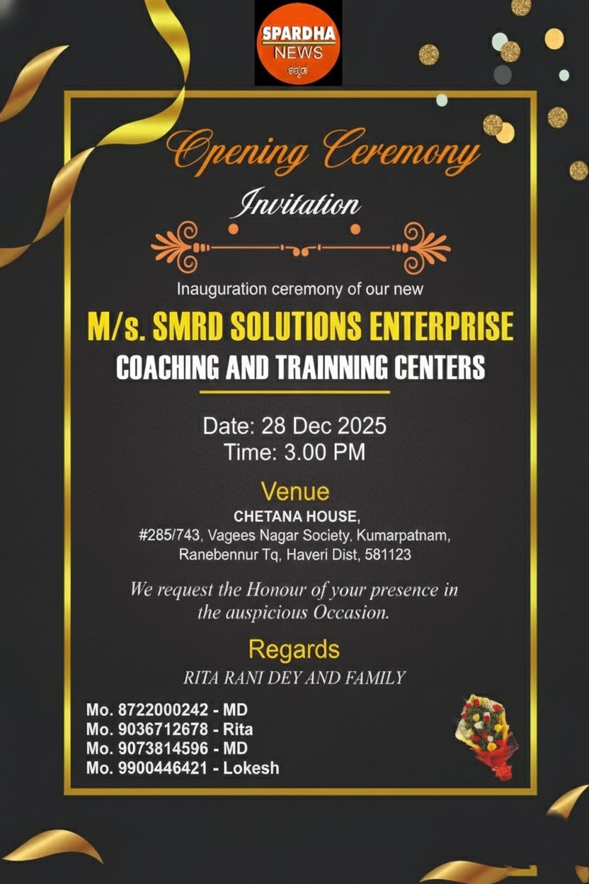 - रानीबेन्नूर: हावेरी जिले के रानीबेन्नूर तालुका के कुमारपट्टनम में आज एक नए शैक्षणिक संस्थान, M/s. SMRD सॉल्यूशंस एंटरप्राइज (कोचिंग और ट्रेनिंग सेंटर्स) का भव्य उद्घाटन समारोह आयोजित किया जाएगा।