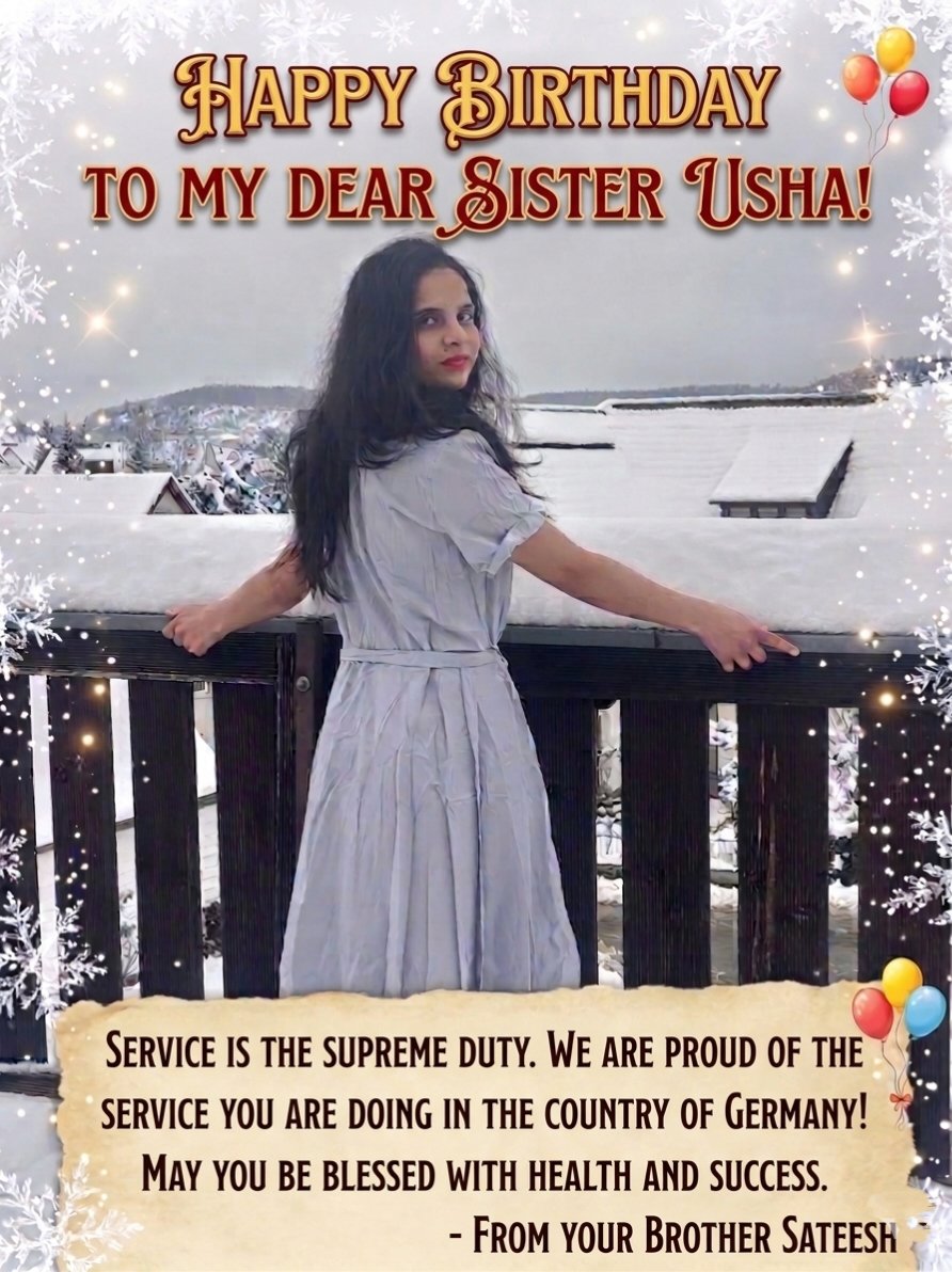 ನನ್ನ ಮುದ್ದು ತಂಗಿ ಉಷಾಗೆ, ಹುಟ್ಟಿದ ಹಬ್ಬದ ಅನಂತ ಪ್ರೀತಿಯ ಶುಭಾಶಯಗಳು! ನೀನು ಇಂದು ನಮ್ಮ ಜೊತೆ ಇಲ್ಲದಿದ್ದರೂ, ನಿನ್ನ ನೆನಪುಗಳು ಮತ್ತು ನೀನು ಸಾಧಿಸುತ್ತಿರುವ ಹಾದಿ ನಮಗೆ ಯಾವತ್ತೂ ಹೆಮ್ಮೆ ತರುತ್ತದೆ. ಸೇವೆಯೇ ಪರಮ ಧರ್ಮ: ಜರ್ಮನ್ನಂತಹ ದೇಶದಲ್ಲಿ, ಆಸ್ಪತ್ರೆಯ ವೃತ್ತಿಯಲ್ಲಿ ನಿನ್ನನ್ನು ನೀನು ತೊಡಗಿಸಿಕೊಂಡು, ಅನ್ಯ ದೇಶದ ಜನರ ನೋವಿಗೆ ಸ್ಪಂದಿಸುತ್ತಿರುವುದು ಸಾಮಾನ್ಯ…