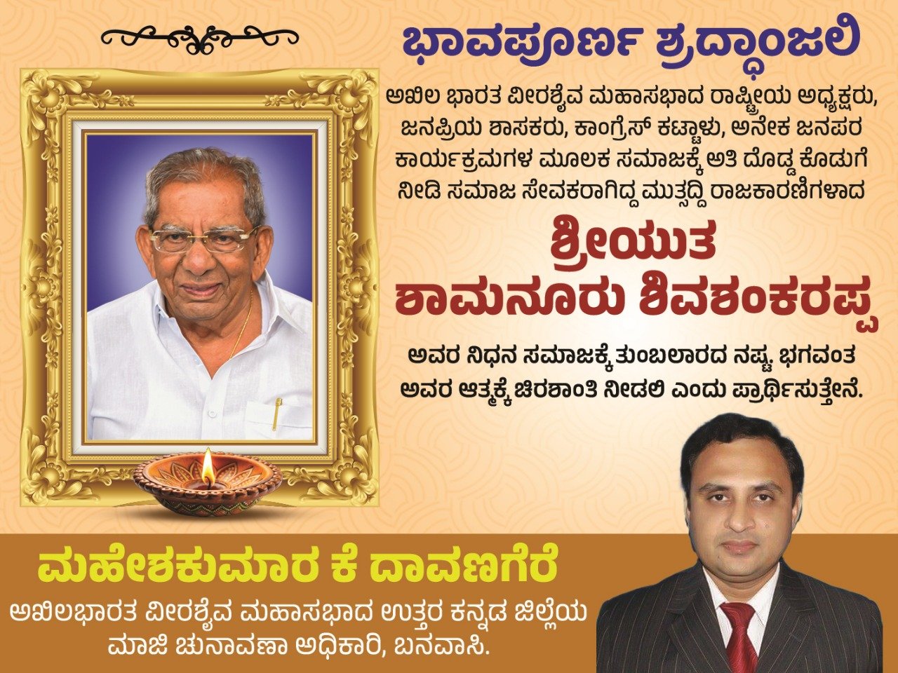 ಅಖಿಲ ಭಾರತ ವೀರಶೈವ ಮಹಾಸಭಾ ದ ರಾಷ್ಟ್ರೀಯ ಅಧ್ಯಕ್ಷರು…ಜನಪ್ರಿಯ ಶಾಸಕರು.. ಕಾಂಗ್ರೆಸ್ ಕಟ್ಟಾಳು… ಅನೇಕ.. ಜನಪರ ಕಾರ್ಯಕ್ರಮಗಳ ಮೂಲಕ ಸಮಾಜಕ್ಕೆ ಅತಿ ದೊಡ್ಡ ಕೊಡುಗೆ ನೀಡಿ… ಸಮಾಜ ಸೇವಕರಾಗಿ.. ಮುತ್ಸದ್ದಿ ರಾಜಕಾರಣಿಗಳಾದ ಶ್ರೀಯುತ ಶಾಮನೂರು ಶಿವಶಂಕ್ರಪ್ಪ ಅವರ ನಿಧನ.. ಸಮಾಜಕ್ಕೆ ತುಂಬಲಾರದ ನಷ್ಟ.. ಭಗವಂತ ಅವರ ಆತ್ಮಕ್ಕೆ ಚಿರಶಾಂತಿ ನೀಡಲಿ ಎಂದು ಪ್ರಾರ್ಥಿಸೋಣ.. 🙏🙏ಓಂ ಶಾಂತಿ..…